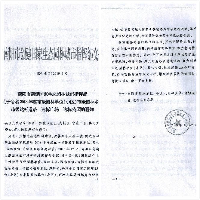 此次我公司喜獲 “南陽市園林式單位”的榮譽稱號,是市級主管部門對我公司優美的綠色生態環境和園林綠化建設維護工作的高度肯定。我們會以此為新起點,不斷加強生態環境建設和綠化養護管理工作,使廠區綠化特色更加顯現,廠區綠化品位更上檔次,打造出更加優美的生態園林廠區環境,為“國家綠色工廠”做好基礎。