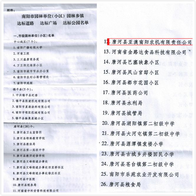 近日,南陽市公布了2018年度全市園林式居住區(單位)評選結果,亞澳南陽農機有限責任公司榜上有名,榮獲市級“園林式單位”榮譽稱號。
