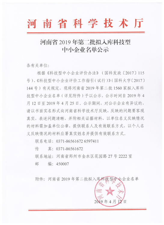 公示.南陽 | 河南省2019年第二批擬入庫科技型中小企業名單公示