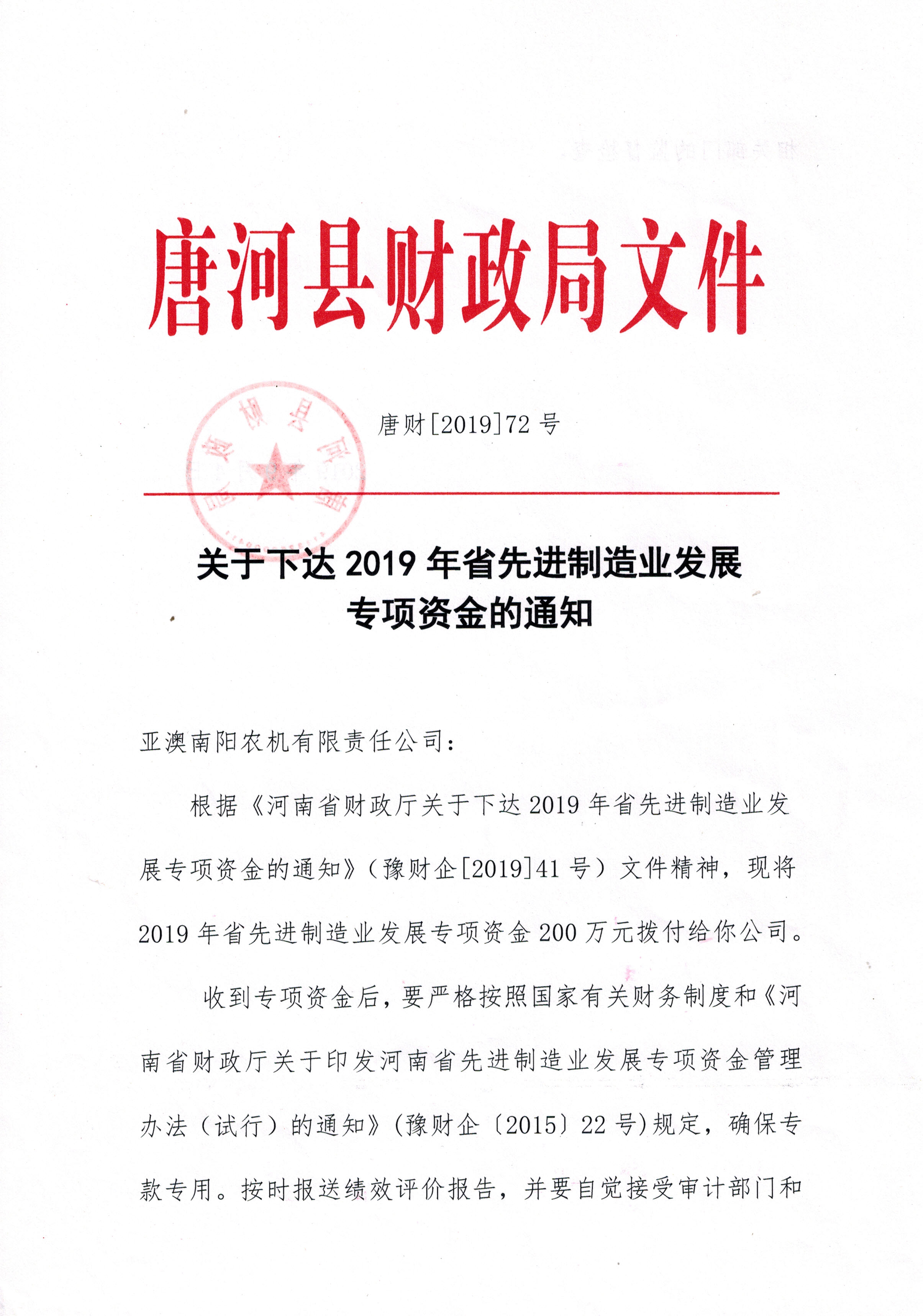 近日,國家工信部下達(dá),河南省政府《印發(fā)<關(guān)于下達(dá)2019年省先進(jìn)制造業(yè)發(fā)展專項(xiàng)獎(jiǎng)金的通知》,對(duì)獲得先進(jìn)制造業(yè)--國家綠色工廠的南陽市唐河縣亞澳南陽農(nóng)機(jī)有限責(zé)任公司的扶持專項(xiàng)資金200萬元下?lián)堋?/span>