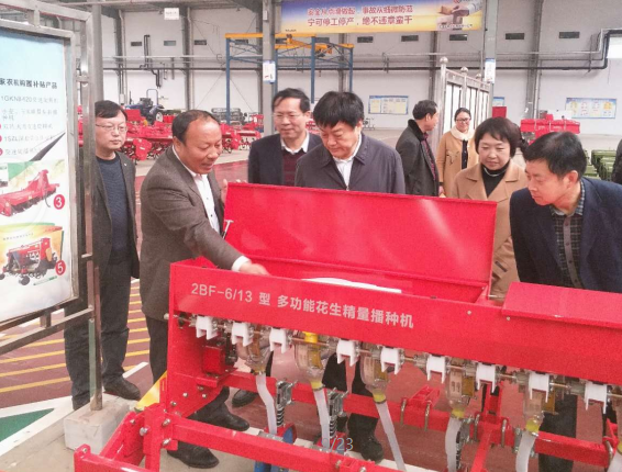 參觀過程中,劉樹華部長親切的向郭總咨詢公司的產品,郭總向劉樹華部長簡述了2BF-6/13 多功能花生精量播種機的功能構造,在得知該款機型當年投產當年熱銷后,劉部長十分高興的對郭總說:“亞澳要進一步開展科技研發工作,多培養、招聘科研人員,增強自身科研力量,成為農機具行業的標桿”,周天龍縣長對劉樹華部長說:“縣政府已批給亞澳30多畝土地,作為亞澳的科技研發中心”。